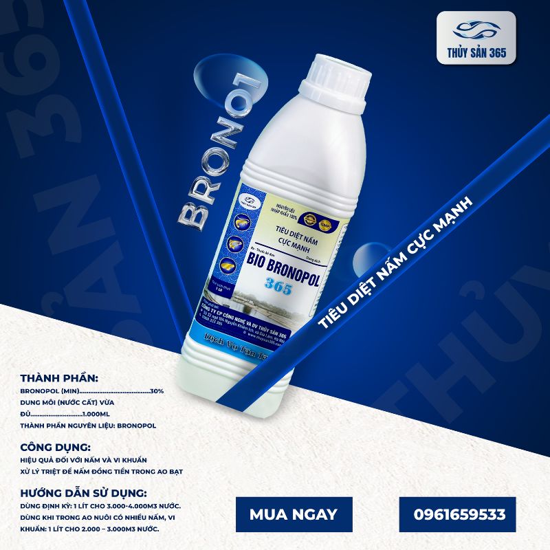 Trong nuôi trồng thủy sản thâm canh và siêu thâm canh, nấm và vi khuẩn gây thiệt hại lớn. Đây là nhóm tác nhân ảnh hưởng trực tiếp đến sức khỏe và tỷ lệ sống của vật nuôi. Tại ao bạt và ao nuôi mật độ cao, nấm phát sinh nhanh và khó xử lý triệt để. Người nuôi cần giải pháp kiểm soát nấm hiệu quả và an toàn. Bronopol được xem là hoạt chất then chốt trong phòng và trị nấm thủy sản. Hoạt chất này giúp kiểm soát nấm bệnh ổn định trong môi trường ao nuôi. Bio Bronopol 365 chứa bronopol hàm lượng cao, được phát triển chuyên biệt cho tôm cá. Sản phẩm giúp xử lý hiệu quả các loại nấm và vi khuẩn gây hại.