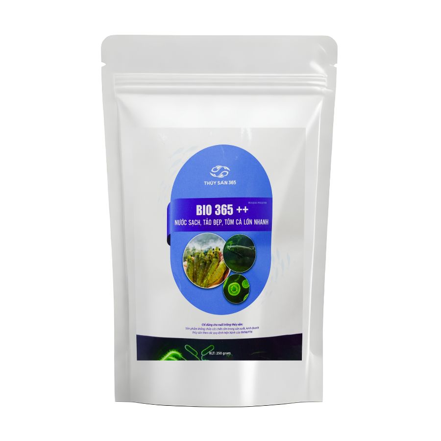 BIO365 ++ – men vi sinh xử lý nước gây tảo và duy trì tảo khuê tạo màu nước. Xử lý hiệu quả các chất hữu cơ dư thừa và khí độc, cải thiện toàn diện chất lượng nước ao. Ngăn ngừa kiểm soát sự phát triển của vi khuẩn Vibro gây ra trên tôm.