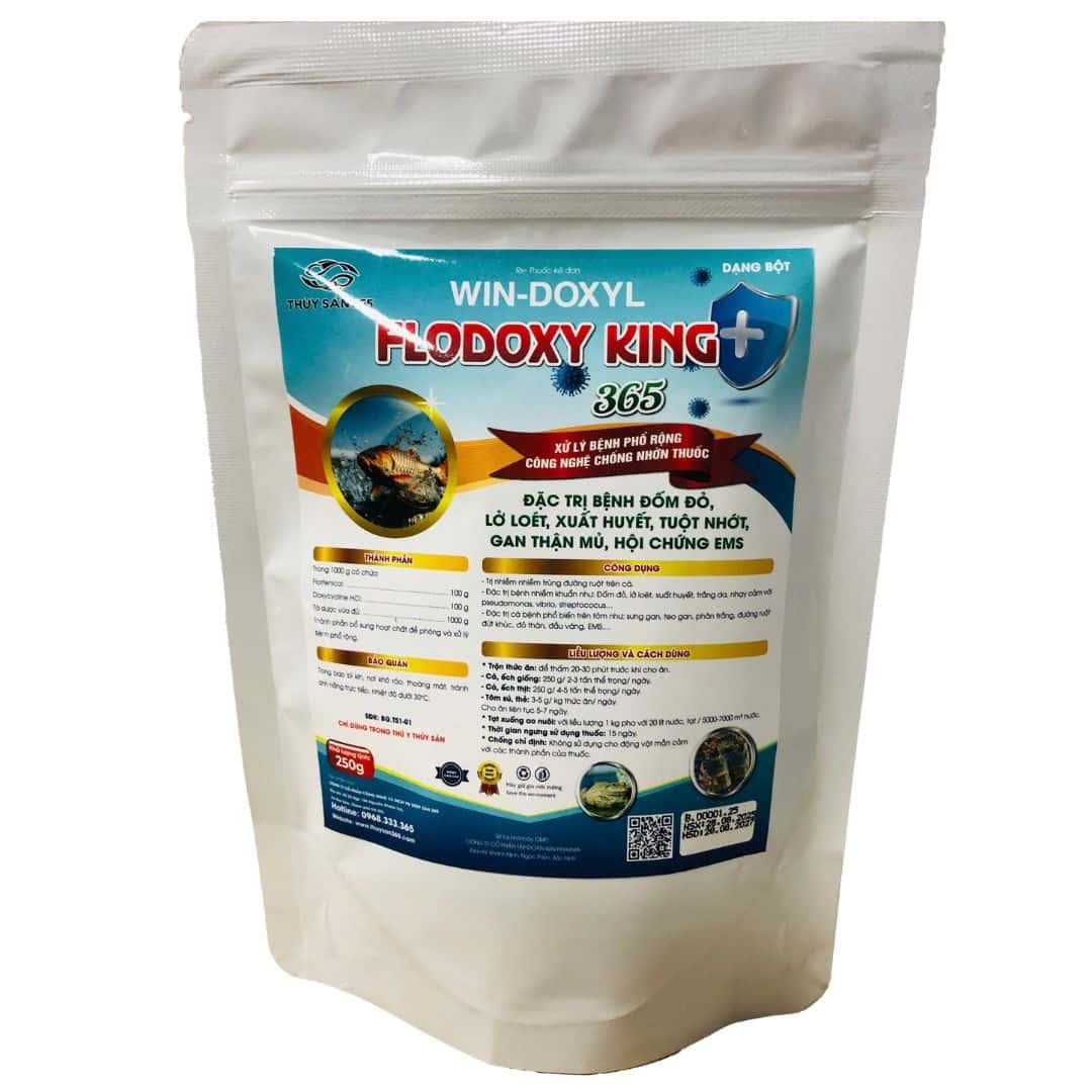 FLODOXY KING 365 (WIN-DOXYL) được nghiên cứu và phát triển nhằm hỗ trợ người nuôi xử lý hiệu quả những bệnh thường gặp ở cá và tôm như: đốm đỏ, lở loét, xuất huyết, tuột nhớt, gan thận mủ và hội chứng EMS. Những bệnh này thường gây thiệt hại nặng nề cho người nuôi nếu không được kiểm soát kịp thời. Với dạng bột tiện lợi, FLODOXY KING 365 giúp quá trình sử dụng trở nên đơn giản, nhanh chóng và an toàn.
