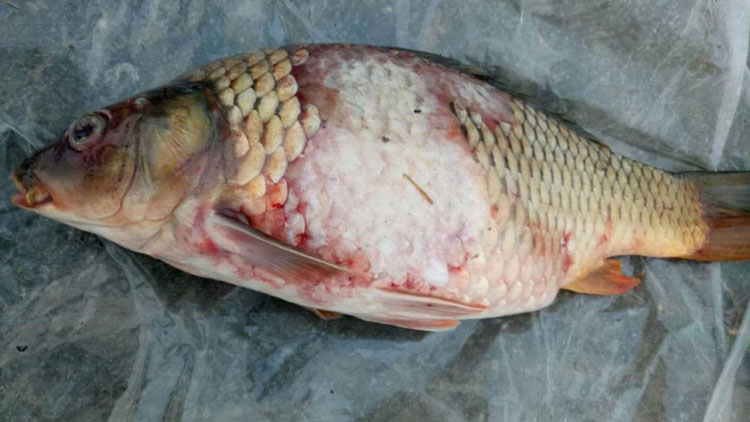 - Da cá chuyển sang màu xám sẫm, xuất hiện các vết loét nhỏ màu đỏ ở đầu, thân và vây.